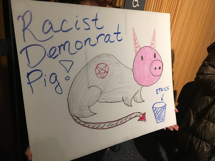 Gabe Okoye, Chairman of the Gwinnett Democratic Party, stated to Hunter that “Demonrats” and “Libtards” live in your district and “you have lost their trust.” He added, you have “one thing left to do: resign.” Another speaker questioned, “How can you have our best interests in mind when you call us ‘Demonrats?'” Another commented, “I’m not a “Demonrat…not a Libtard”…I’m a Constitutent.”