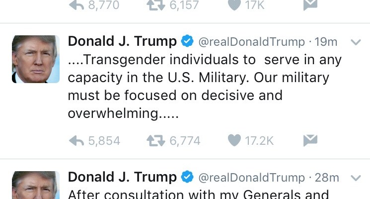 At a campaign event in Manchester, N.H., then Candidate Trump said, “Ask yourself who is really a friend of women and the L.G.B.T community, Donald Trump with actions or Hillary Clinton with her words?” The tweet from Wednesday drew a stark contrast from that speech. On Thursday, the nation’s top uniformed military officer Gen. Joseph Dunford, chairman of the Joint Chiefs of Staff, stated “There will be no modifications to the current policy until the president’s direction has been received by the secretary of Defense and the secretary has issued implementation guidance. In the meantime, we will continue to treat all personnel with respect.” The first openly gay Secretary of the Army Eric Fanning, an Obama appointee, said [he found] “it offensive for the commander in chief to say thousands of patriotic Americans in uniform are a burden.” As of yet, the Trump Administration has issued no formal policy directive to the DoD to change the transgendered service policy.