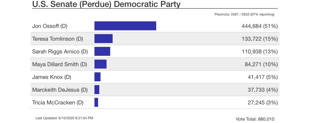 +1 day 8:35 pm—With 97% reporting, Ossoff has been declared the winner of the U.S. Senate Democratic Primary. He will face current Georgia Sen. David Perdue in November.