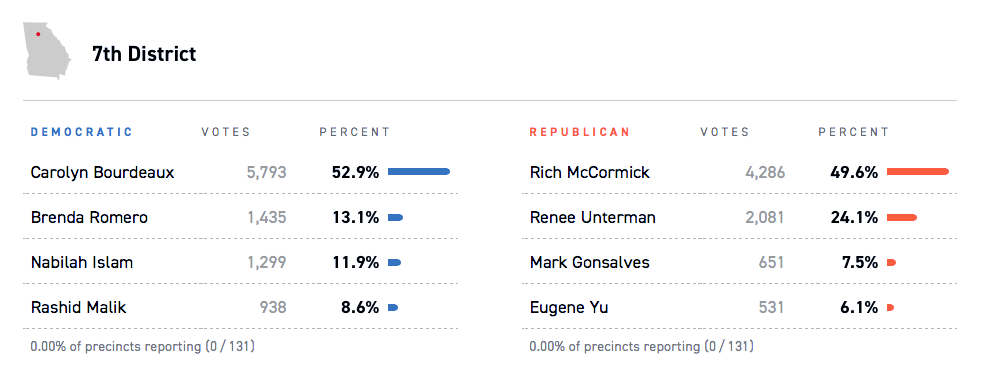 *Georgia 7th Congressional District seat, which was a contest that drew significant attention in the 2018 midterms. There is a crowded field of both Republicans and Democrats.