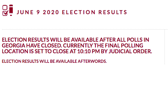 10:10 pm—The last polls have presumably closed in Georgia. Earlier this evening, the Georgia Secretary of State’s Office was showing this message.