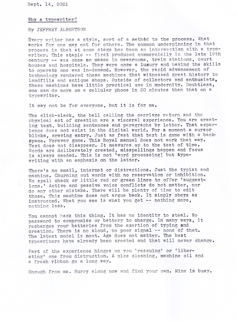 Depending on where you live, most antique stores will have some kind of affordable typewriter in good working order. The problem is where a store wants too much for the machine just because it’s “old.” A good solid machine, in good working order, should be about $50-75. With a new ribbon, a little oil and fresh slug cleaning — it will be like new. Whatever you decide to buy, just make sure it’s in good shape. Good luck!