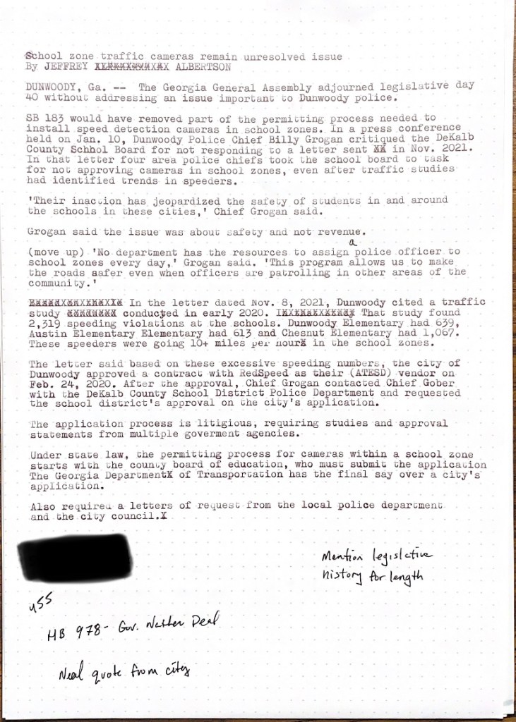 A recent story I wrote takes up the issue of school zone traffic cameras in the city of Dunwoody, Ga.