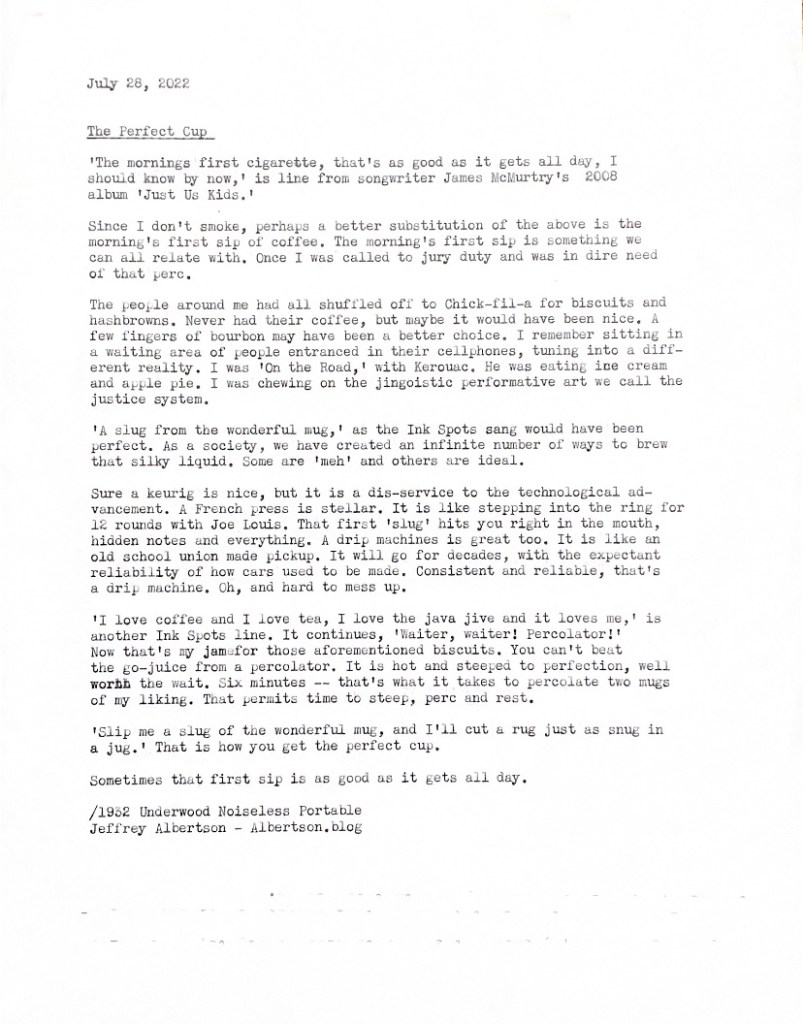 The Perfect Cup Links: James McMurtry – Hurricane Party ; Ink Spots – Java Jive. Written on an Underwood Noiseless portable. Related